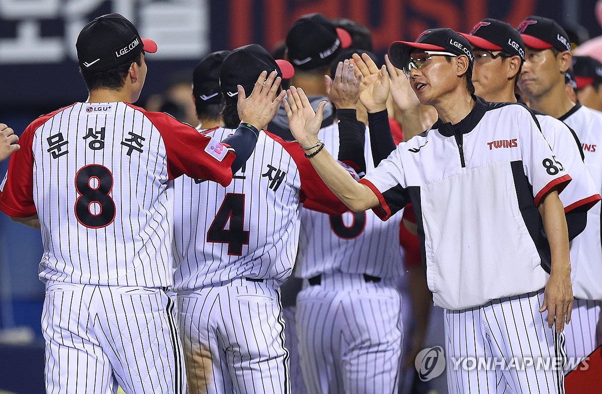 (서울=연합뉴스) 김도훈 기자 = 20일 서울 잠실야구장에서 열린 프로야구 2025 신한 SOL 뱅크 KBO리그 롯데 자이언츠와 LG 트윈스 경기에서 3-2로 역전승을 거둔 LG 염경엽 감독이 문성주와 하이파이브를 하고 있다. 2025.7.20 superdoo82@yna.co.kr