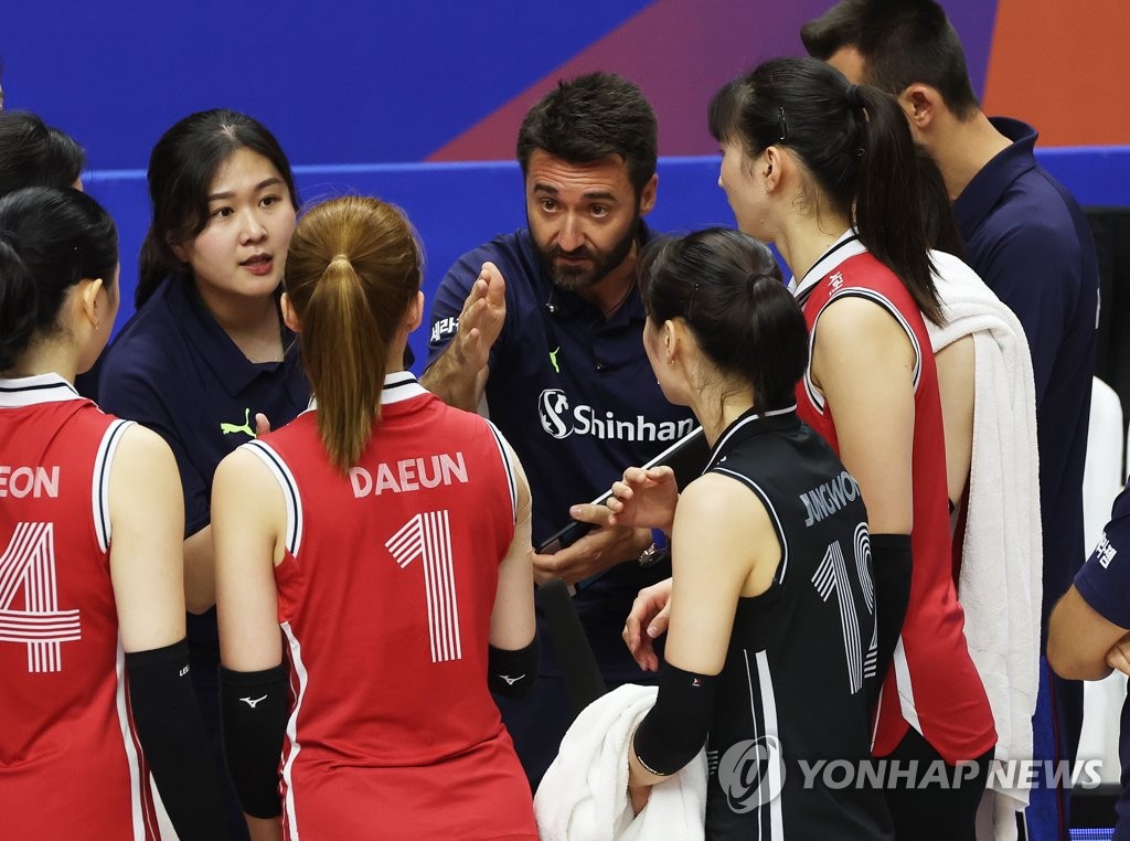 (수원=연합뉴스) 홍기원 기자 = 29일 경기도 서수원칠보체육관에서 열린 2023 국제배구연맹(FIVB) 발리볼네이션스리그(VNL) 한국과 도미니카공화국의 경기. 한국 세사르 곤살레스 감독이 작전을 지시하고 있다. 2023.6.29 xanadu@yna.co.kr