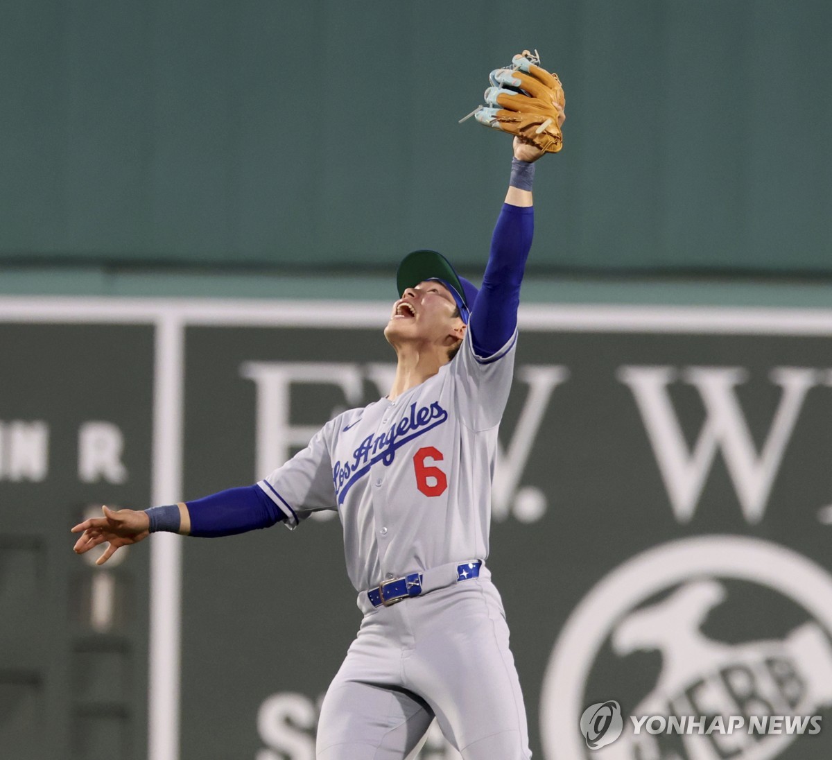 (보스턴 AP=연합뉴스) 김혜성이 26일(한국시간) 미국 매사추세츠주 보스턴의 펜웨이 파크에서 열린 2025 미국프로야구 메이저리그(MLB) 보스턴 레드삭스와 방문 경기, 3회말에 뜬공을 처리하고 있다.
