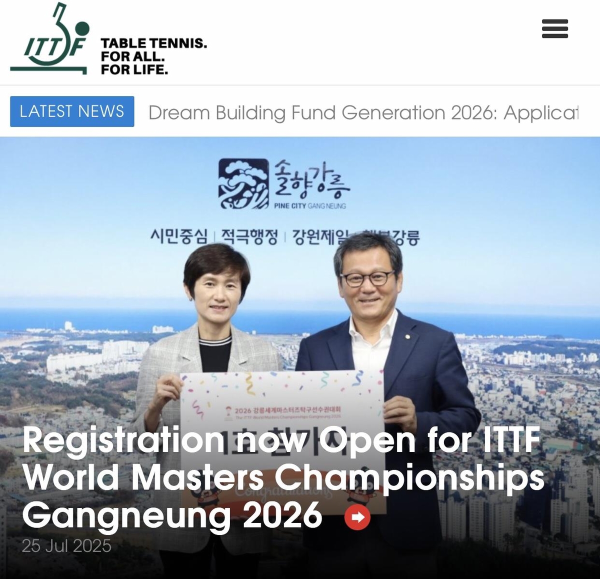 (서울=연합뉴스) 이동칠 기자 = 내년 6월 강원도 강릉에서 개최되는 강릉세계마스터즈선수권대회 참가 신청 시작이 국제탁구연맹(ITTF) 홈페이지의 주요 소식으로 다뤄졌다.