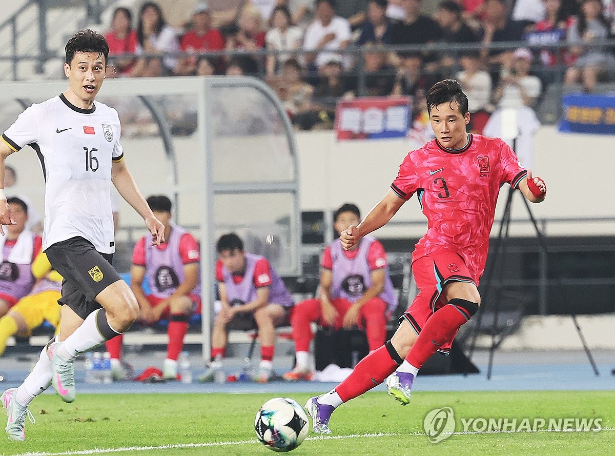 (용인=연합뉴스) 홍기원 기자 = 7일 경기도 용인미르스타디움에서 열린 2025년 동아시아축구연맹(EAFF) E-1 챔피언십(동아시안컵) 남자부 1차전 한국과 중국의 경기. 한국 이태석이 패스하고 있다. 2025.7.7 xanadu@yna.co.kr