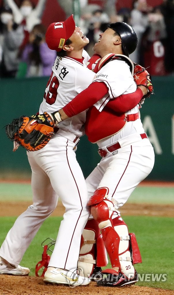 (인천=연합뉴스) 윤태현 기자 = 8일 인천 SSG 랜더스필드에서 열린 2022 프로야구 KBO리그 한국시리즈 6차전 경기. SSG가 한국시리즈 우승을 확정 짓자 김광현과 이재원이 얼싸안으며 기뻐하고 있다. 2022.11.8 tomatoyoon@yna.co.kr