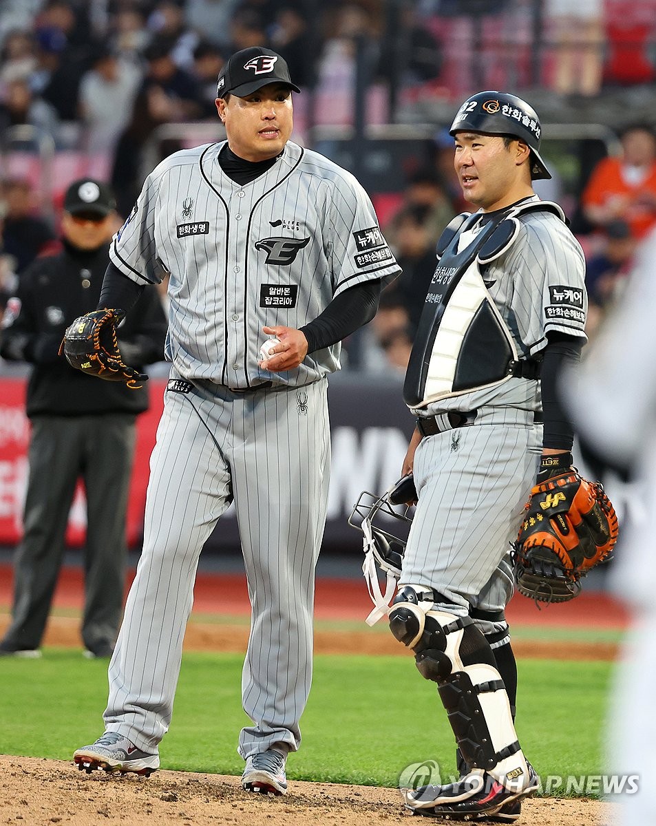 (수원=연합뉴스) 김도훈 기자 = 24일 경기도 수원케이티위즈파크에서 열린 2024 KBO리그 프로야구 한화 이글스와 kt wiz의 경기. 3회말 1사 1루 한화 선발 류현진이 볼넷을 허용하자 이재원이 마운드로 올라와 이야기하고 있다. 2024.4.24 superdoo82@yna.co.kr