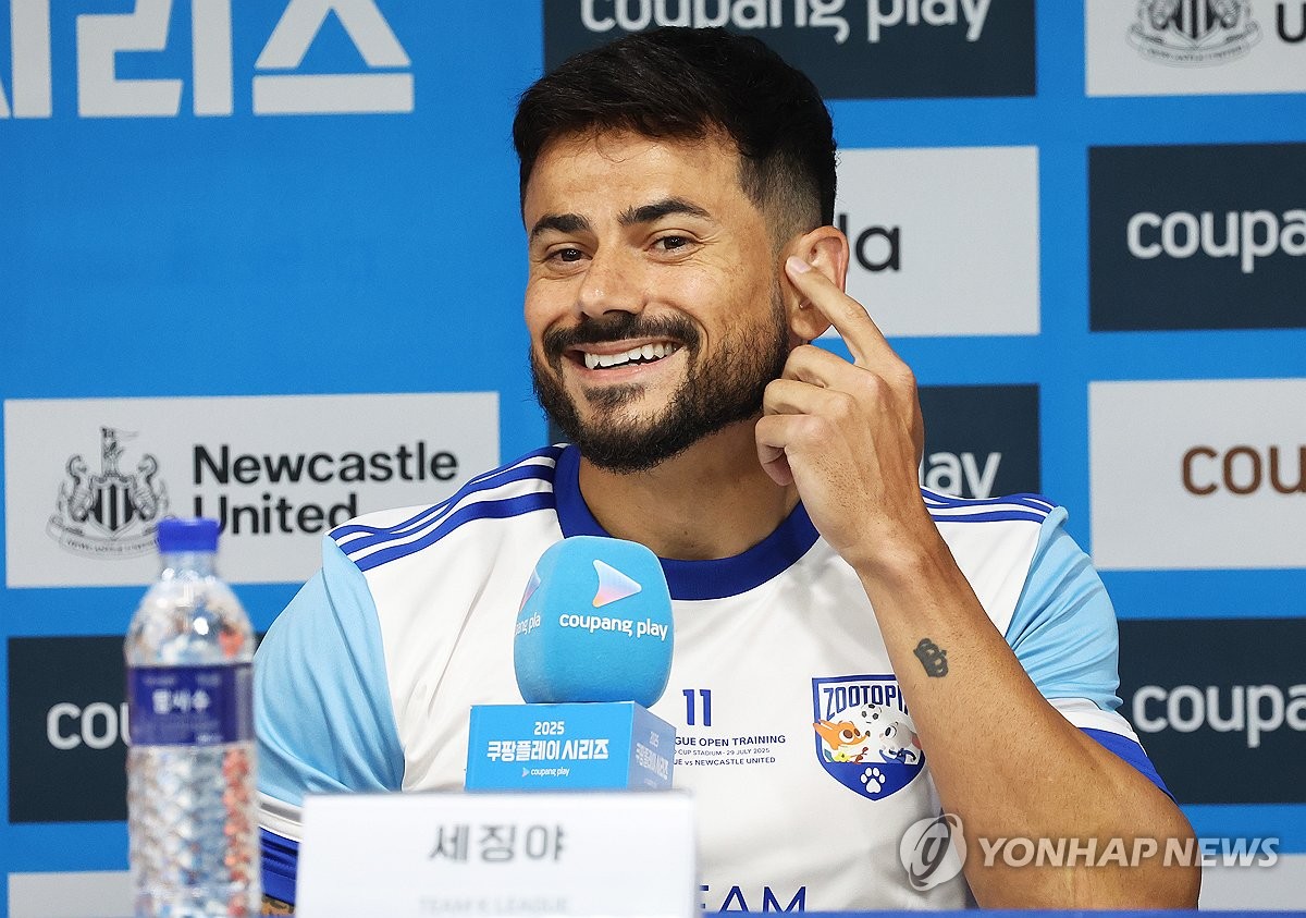 (수원=연합뉴스) 홍기원 기자 = 뉴캐슬 유나이티드와 2025 쿠팡플레이 시리즈 1경기를 앞둔 팀K리그 세징야가 29일 경기도 수원월드컵경기장에서 열린 기자회견에서 취재진 질문에 답하고 있다. 2025.7.29 xanadu@yna.co.kr