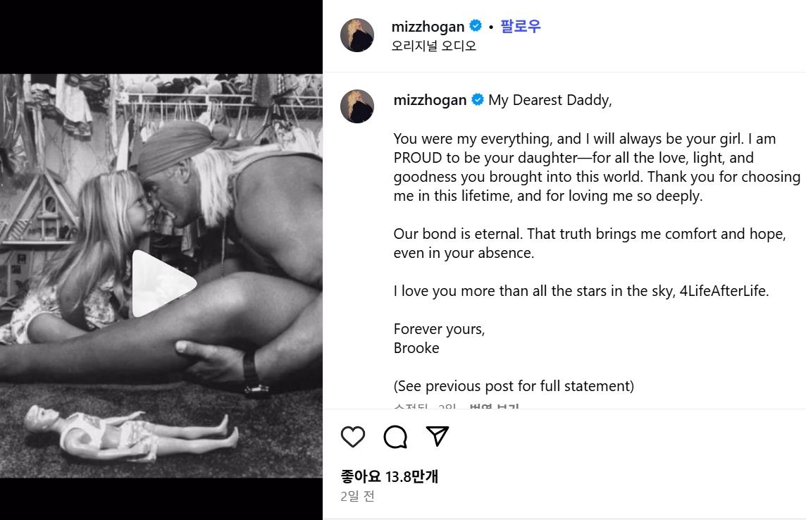 브룩 호건'이란 이름으로 가수로 활동해온 호건의 딸 브룩 볼리아는 최근 인스타그램에 어린 시절부터 아버지와 함께 찍은 많은 사진을 공유하며 "당신은 나의 전부였고 나는 당신의 딸인 것이 자랑스러웠다. 나를 정말 깊이 사랑해줘서 감사하다. 우리의 결속은 영원할 것"이라고 썼다.