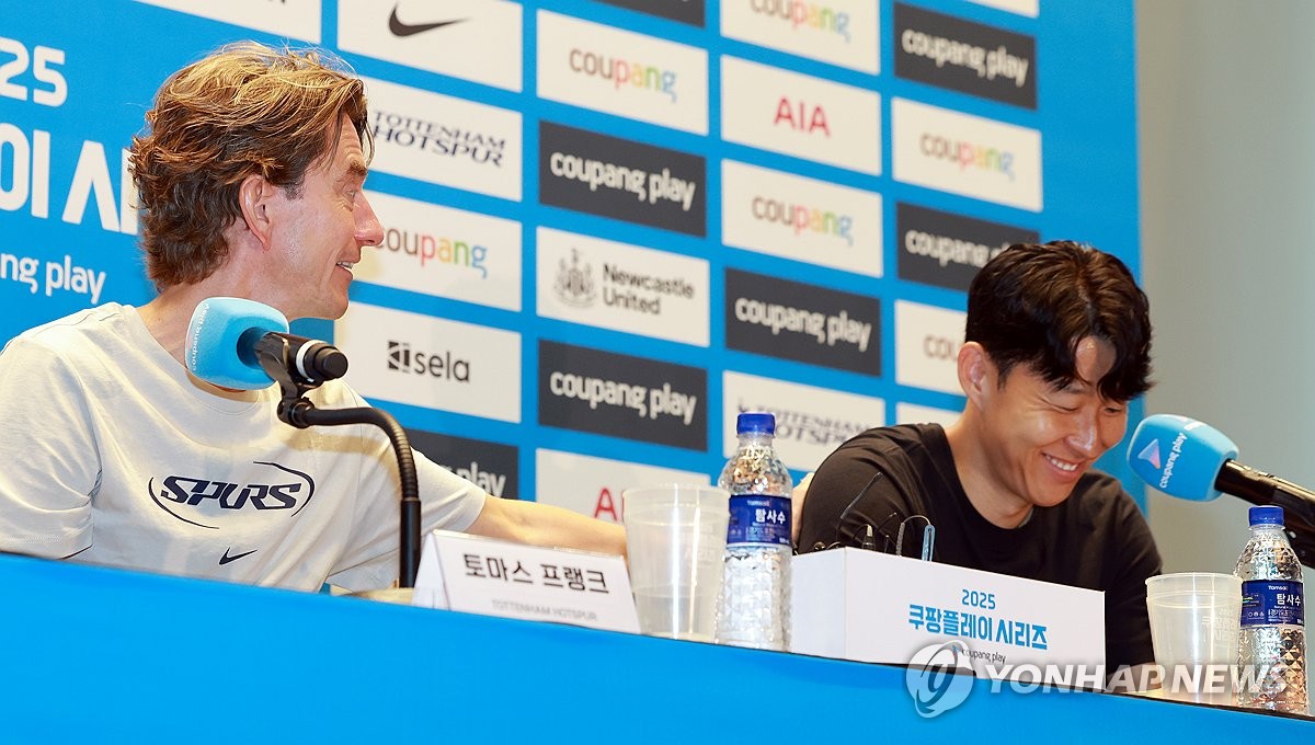 (서울=연합뉴스) 신현우 기자 = 잉글랜드 프로축구 토트넘 토마스 프랑크 감독이 2일 서울 영등포구 IFC 더포럼에서 열린 2025 쿠팡플레이 시리즈 기자회견에 참석해 취재진 질문에 답하며 손흥민 등을 두드리고 있다.