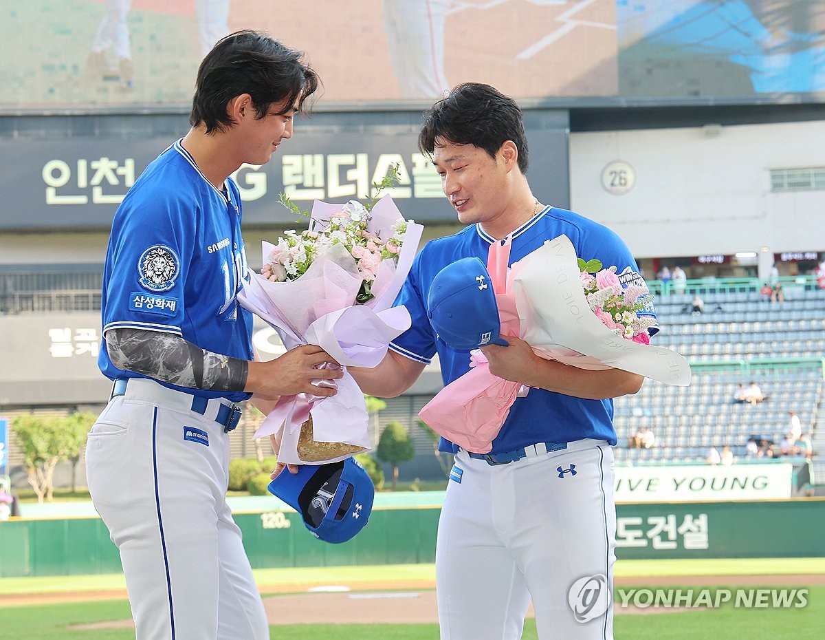 (인천=연합뉴스) 임순석 기자 = 삼성 라이온즈 오승환이 7일 인천 SSG랜더스필드에서 열린 2025 프로야구 삼성 라이온즈와 SSG 랜더스의 경기를 앞두고 열린 자신의 은퇴 기념행사에서 동료 구자욱 선수로부터 꽃다발을 받고 있다. 2025.8.7 soonseok02@yna.co.kr