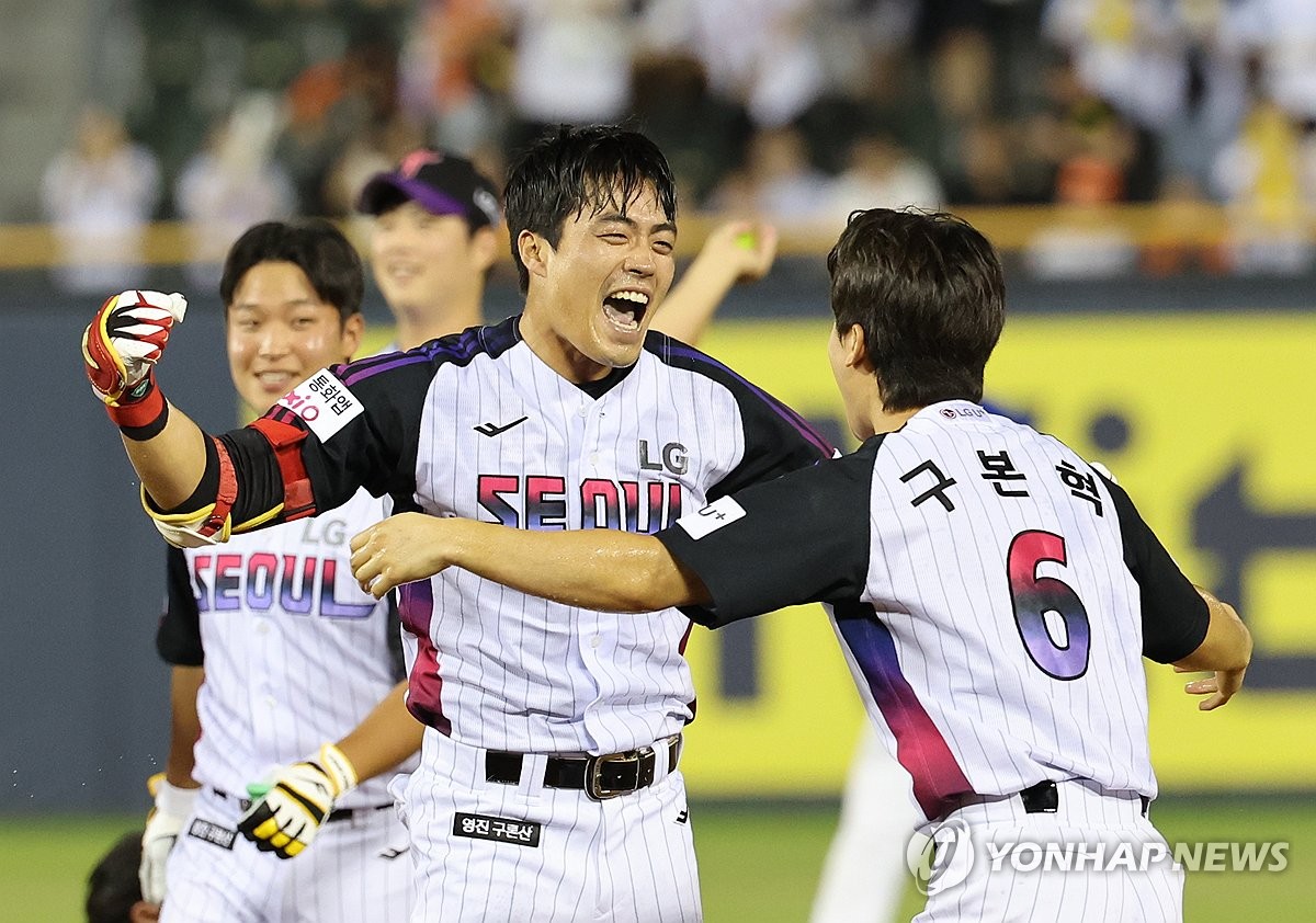 (서울=연합뉴스) 김동찬 기자 = 프로야구 LG 트윈스가 연장 10회말에 터진 천성호의 끝내기 안타로 한화 이글스와의 '미리 보는 한국 시리즈'에서 짜릿한 역전승을 거뒀다.