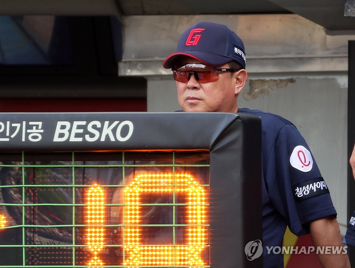 (광주=연합뉴스) 조남수 기자 = 6일 광주기아챔피언스필드에서 열린 프로야구 롯데 자이언츠와 KIA 타이거즈의 경기. 롯데 김태형 감독이 2회말 경기를 지켜보고 있다. 2025.7.6 iso64@yna.co.kr