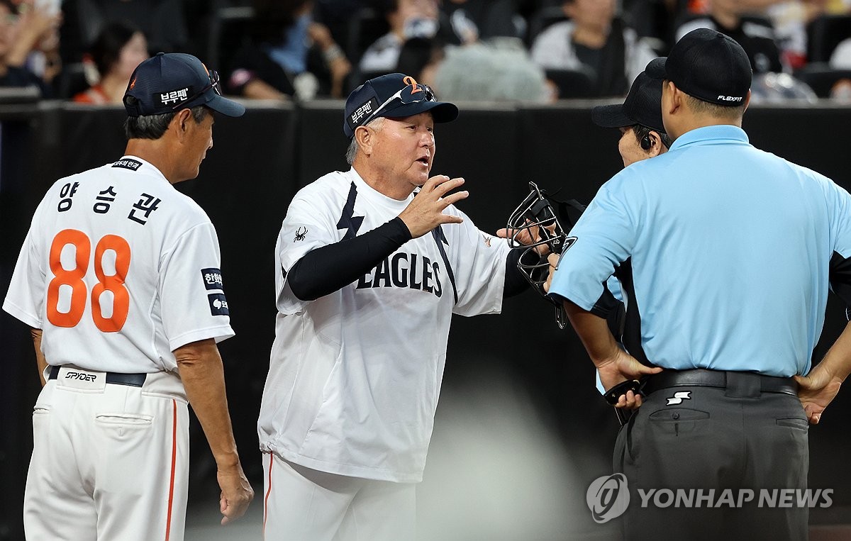 (대전=연합뉴스) 김준범 기자 = 12일 대전 한화생명이글스파크에서 열린 프로야구 롯데 자이언츠와 한화 이글스의 경기. 3회초 롯데 공격 때 한화 김경문 감독이 심판진에게 항의하고 있다. 2025.8.12 psykims@yna.co.kr