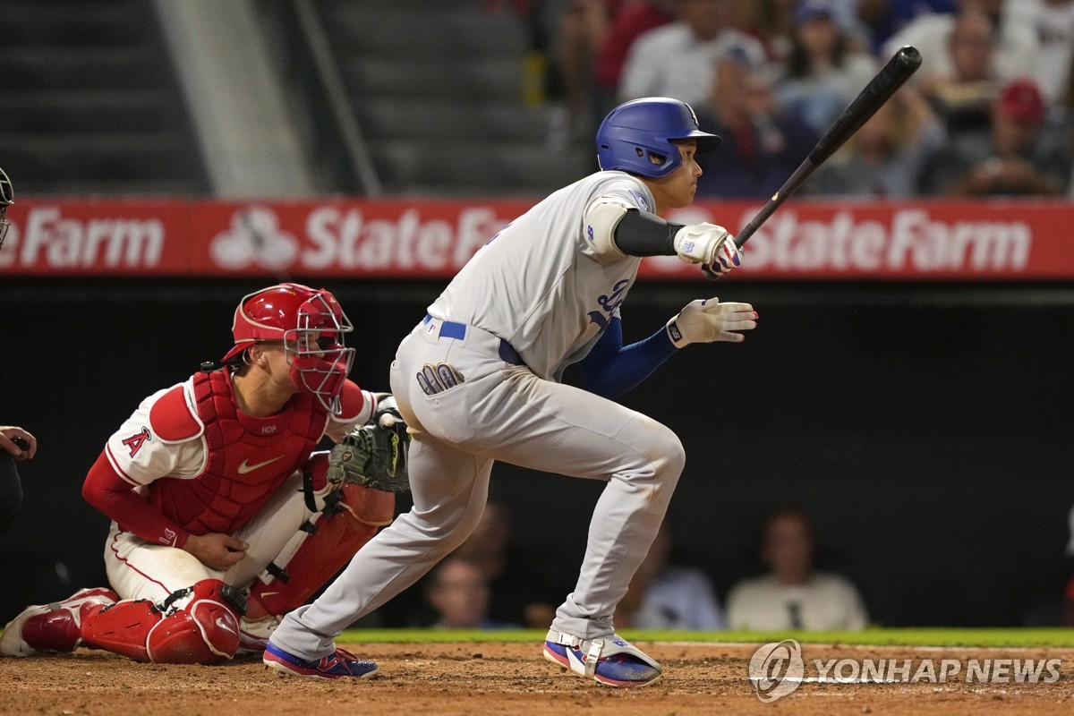 (애너하임 AP=연합뉴스) 다저스 오타니가 13일(한국시간) 미국 캘리포니아주 애너하임의 에인절스타디움에서 열린 메이저리그 에인절스와 방문 경기, 6회 무사 1, 2루에서 타격하고 있다. 이 공이 유격수에게 걸리면서 트리플 플레이가 됐다.