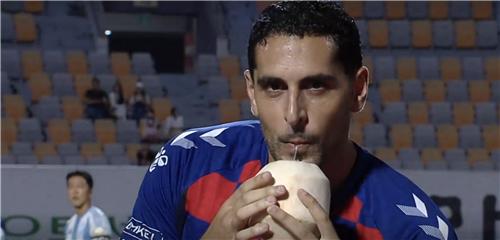 이어 코코넛을 들고 벤치 쪽으로 가 김은중 수원FC 감독에게 건네고 90도로 인사했다.