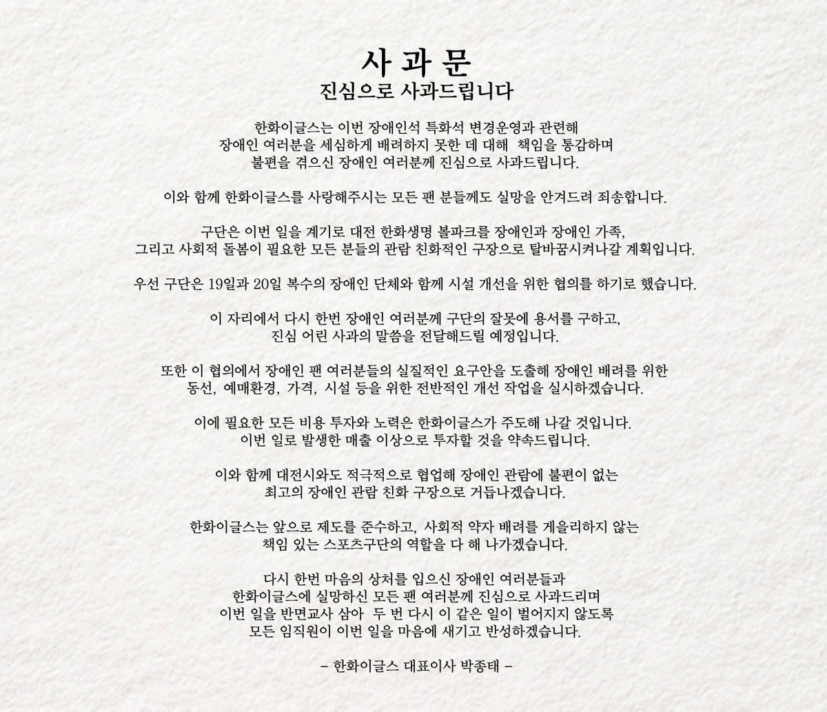 한화는 19일 "진심으로 사과드립니다"로 시작하는 사과문을 통해 "이번 장애인석 특화석 변경 운영과 관련해 장애인 여러분을 세심하게 배려하지 못한 데 대해 책임을 통감하며 불편을 겪으신 장애인 여러분께 진심으로 사과드린다"고 밝혔다.