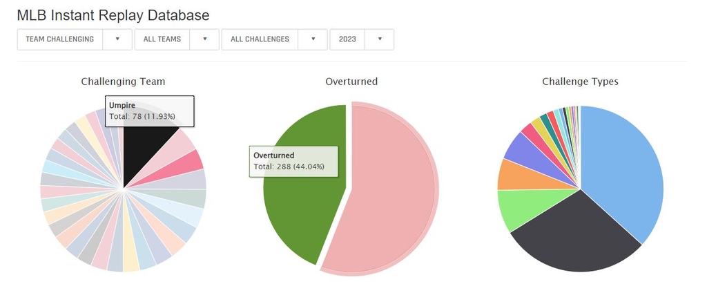 MLB 사무국이 집계한 올해 비디오 판독 자료를 보면, 22일 현재 원심 유지는 55.96%(366건), 번복은 44.04%(288건)로 번복률이 무척 높았다.