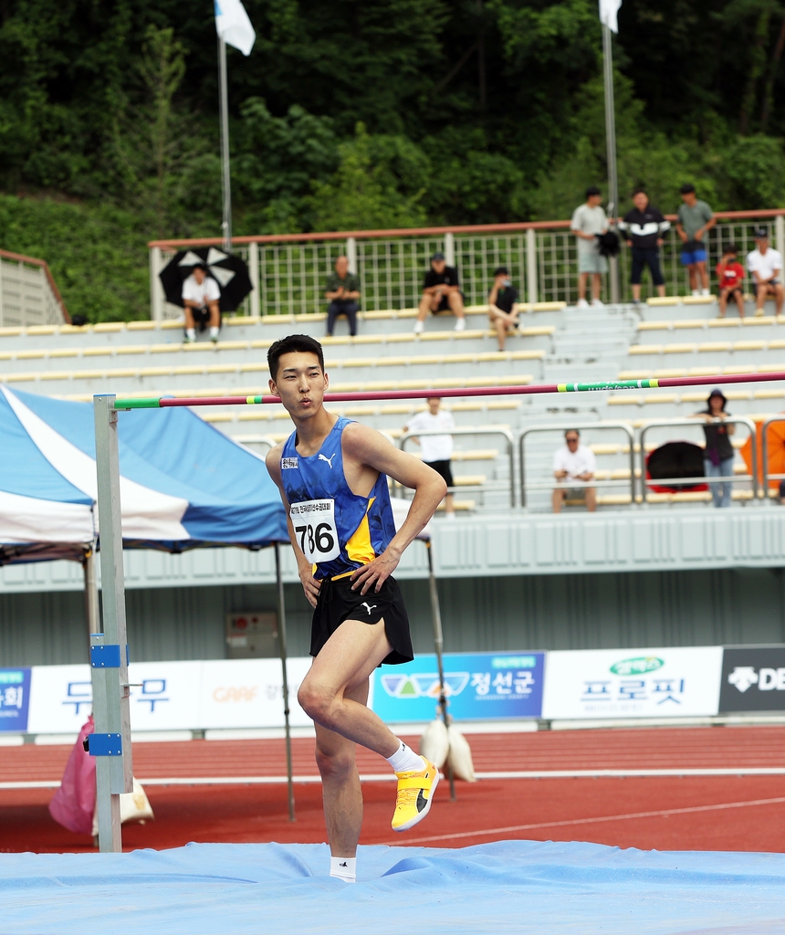 (서울=연합뉴스) 우상혁이 25일 정선 종합운동장에서 열린 2023 전국육상선수권대회 남자 높이뛰기 결선에서 바를 넘은 뒤 관중석을 바라보고 있다. [대한육상연맹 제공. 재판매 및 DB금지]