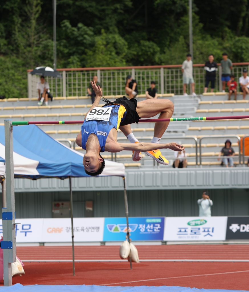 (서울=연합뉴스) 우상혁이 25일 정선 종합운동장에서 열린 2023 전국육상선수권대회 남자 높이뛰기 결선에서 바를 넘고 있다. [대한육상연맹 제공. 재판매 및 DB금지]