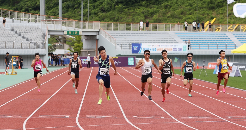 (서울=연합뉴스) 고승환(왼쪽 세 번째)이 25일 정선 종합운동장에서 열린 2023 전국육상선수권대회 남자 200m 결선에서 가장 먼저 결승선을 통과하고 있다. [대한육상연맹 제공. 재판매 및 DB금지]