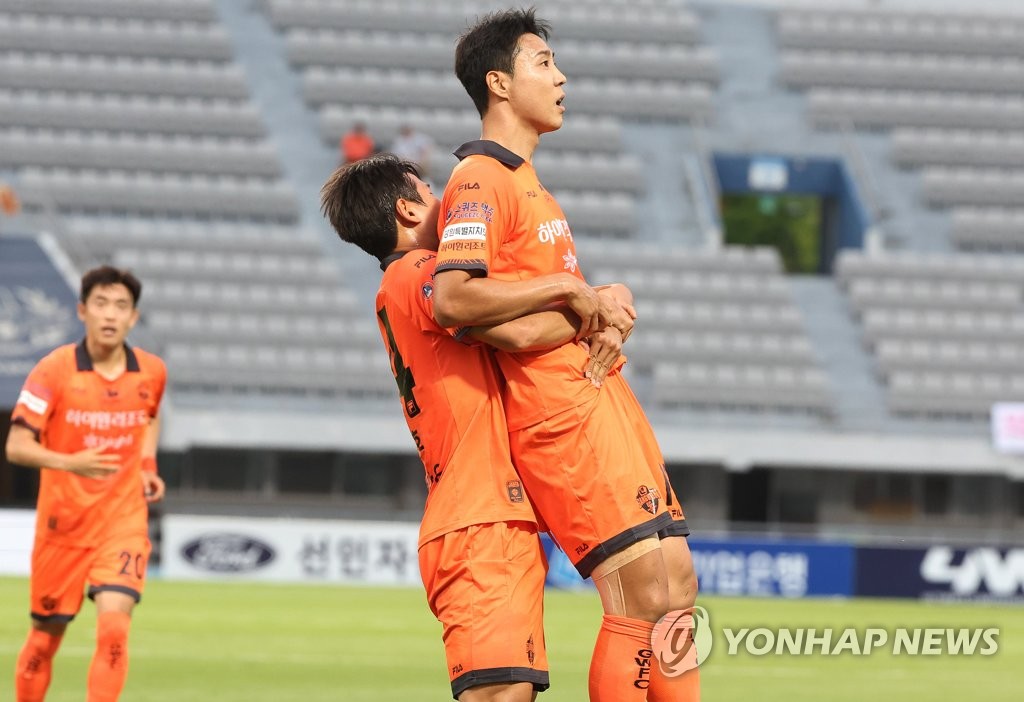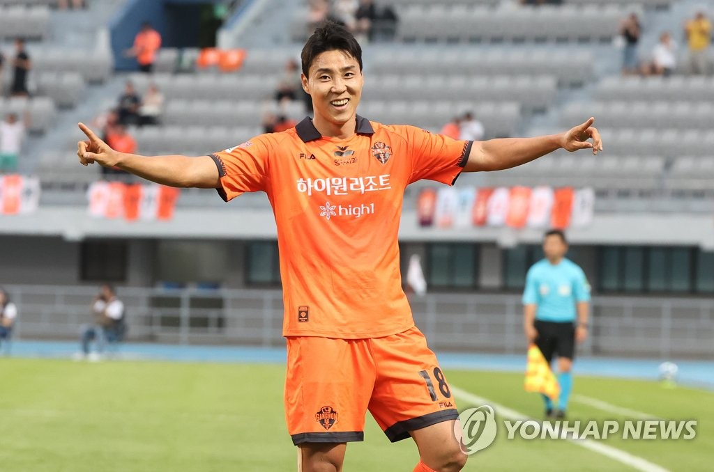 (수원=연합뉴스) 홍기원 기자 = 25일 경기도 수원종합운동장에서 열린 '하나원큐 K리그 1' 수원FC와 강원FC의 경기. 골을 넣은 강원FC 이정협이 기뻐하고 있다. 2023.6.25 xanadu@yna.co.kr