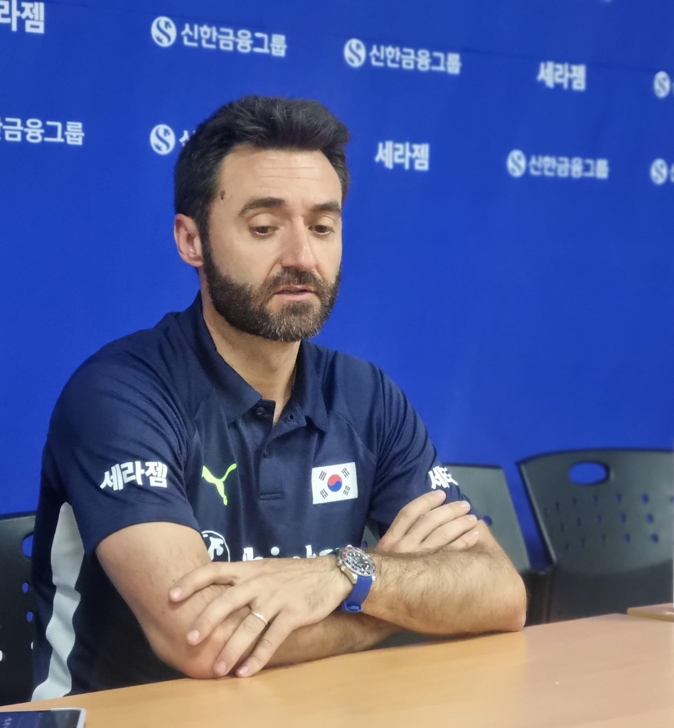 (수원=연합뉴스) 김경윤 기자 = 세사르 곤살레스 여자배구대표팀 감독이 27일 경기도 수원 서수원칠보체육관에서 열린 2023 국제배구연맹(FIVB) 발리볼네이션스리그(VNL) 불가리아전에서 패한 뒤 인터뷰하고 있다. 2023.6.27. cycle@yna.co.kr