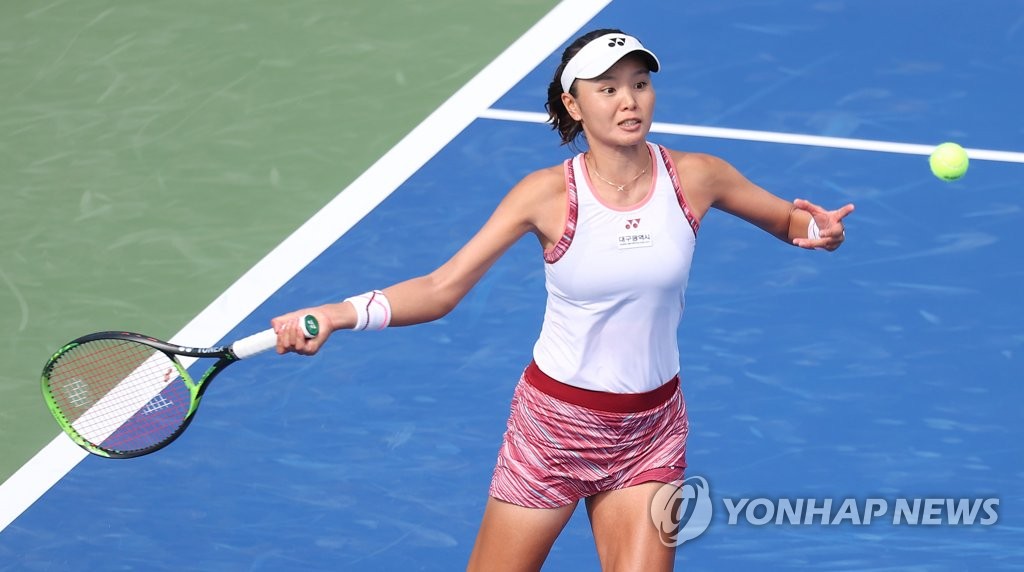 (서울=연합뉴스) 신현우 기자 = 19일 서울 송파구 올림픽공원 테니스코트에서 열린 여자프로테니스(WTA) 투어 하나은행 코리아오픈 단식 32강전 장수정(대구시청)과 주린(중국)의 경기. 장수정이 공을 받아치고 있다. 2022.9.19 nowwego@yna.co.kr