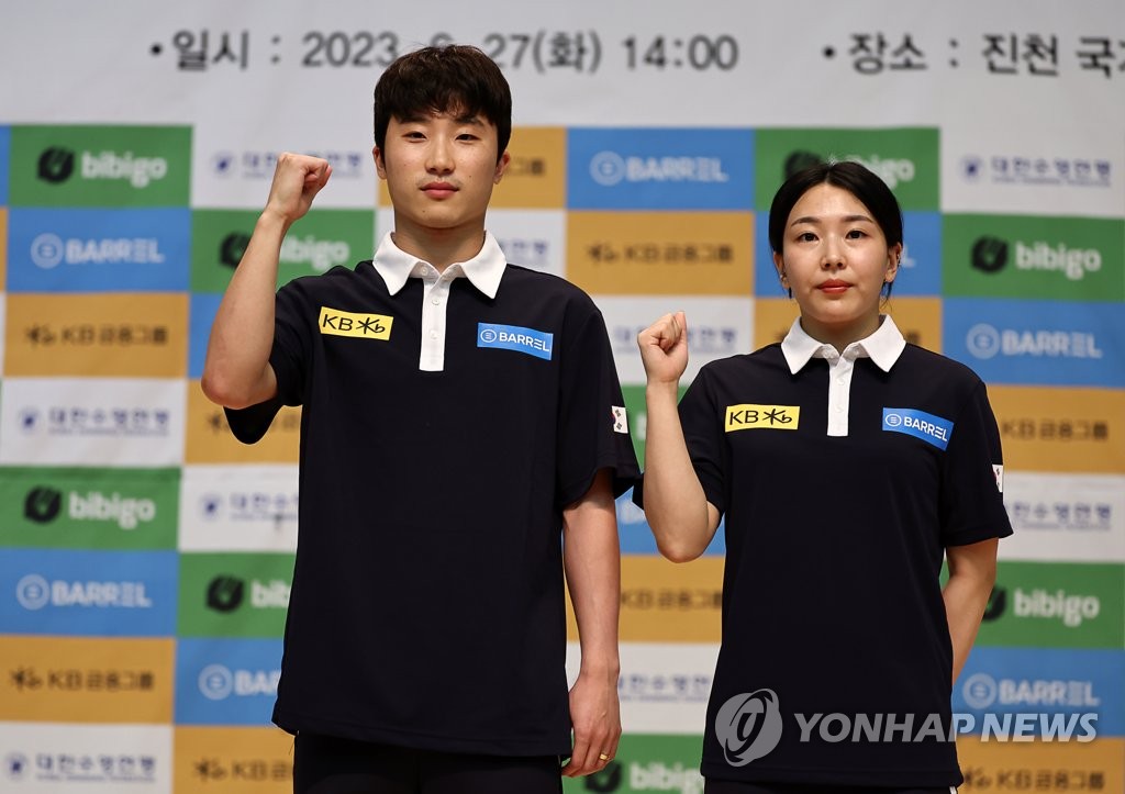 (진천=연합뉴스) 윤동진 기자 = 27일 오후 진천선수촌에서 열린 수영 국가대표팀 미디어데이에서 다이빙 우하람과 김수지가 포즈를 취하고 있다. 2023.6.27 mon@yna.co.kr