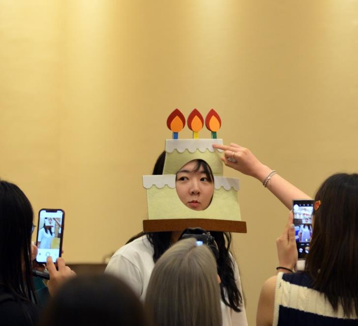 (히타치나카=연합뉴스) 김경윤 기자 = 생일을 앞둔 GS칼텍스 주장 강소휘가 16일 일본 이바라키현 히타치나카시 미토 게이세이 호텔에서 열린 전지훈련 팬 미팅 행사에서 케이크로 변신하는 등 적극적인 팬서비스 활동을 하고 있다. cycle@yna.co.kr
