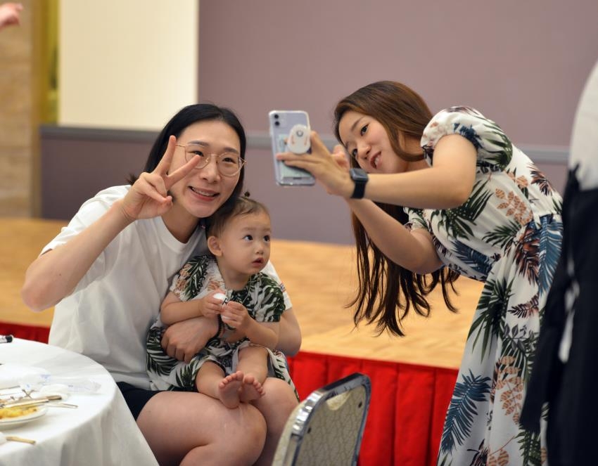 (히타치나카=연합뉴스) 김경윤 기자 = GS칼텍스 미들블로커 한수지(맨 왼쪽)가 16일 일본 이바라키현 히타치나카시 미토 게이세이 호텔에서 열린 전지훈련 팬 미팅 행사에서 아기 팬과 기념사진을 찍고 있다. cycle@yna.co.kr
