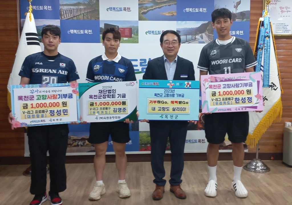 옥천군은 프로배구에서 활약하는 정성민(대한항공)·한성정(우리카드)·김영준(〃) 선수가 최근 고향을 찾아 황규철 군수에게 100만원씩 기부금을 전달했다고 17일 밝혔다.
