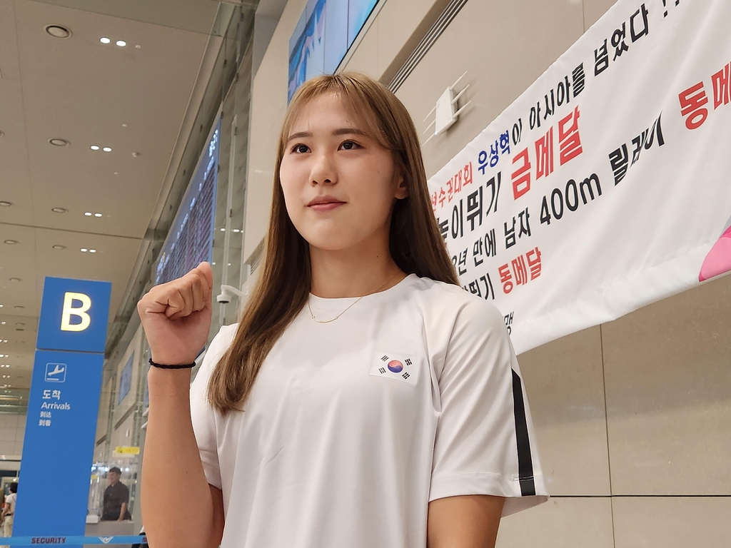 (영종도=연합뉴스) 하남직 기자 = 한국 여자 육상 단거리 국가대표 김다은이 17일 인천국제공항에서 취재진과 인터뷰하고 있다.