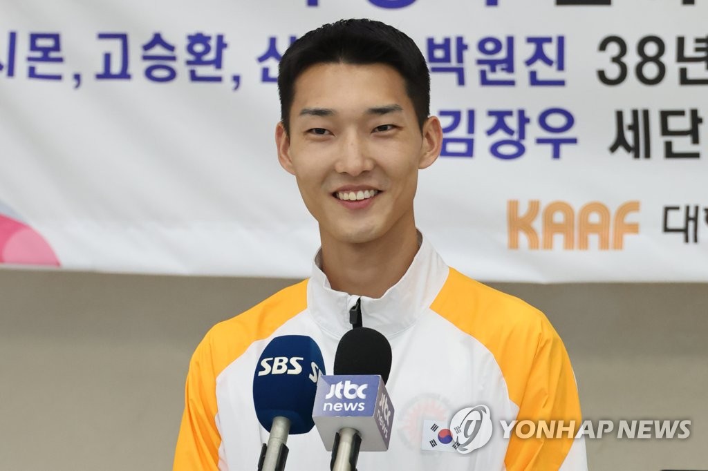 (영종도=연합뉴스) 김주성 기자 = 2023 아시아육상선수권대회 남자 높이뛰기에서 6년 만에 우승을 차지한 우상혁이 17일 오후 인천공항을 통해 귀국, 취재진의 질문에 답하고 있다. 2023.7.17 utzza@yna.co.kr