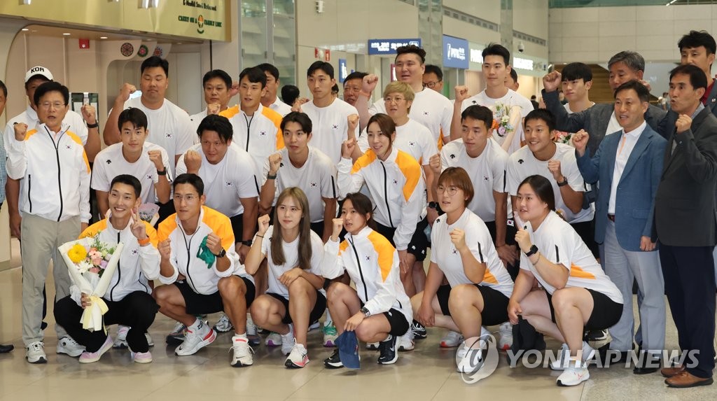 (영종도=연합뉴스) 김주성 기자 = 2023 아시아육상선수권대회 남자 높이뛰기에서 6년 만에 우승을 차지한 우상혁 등 육상 대표팀 선수들이 17일 오후 인천공항을 통해 귀국, 육현표 대한육상연맹 회장 등과 함께 기념촬영을 하고 있다. 2023.7.17 utzza@yna.co.kr