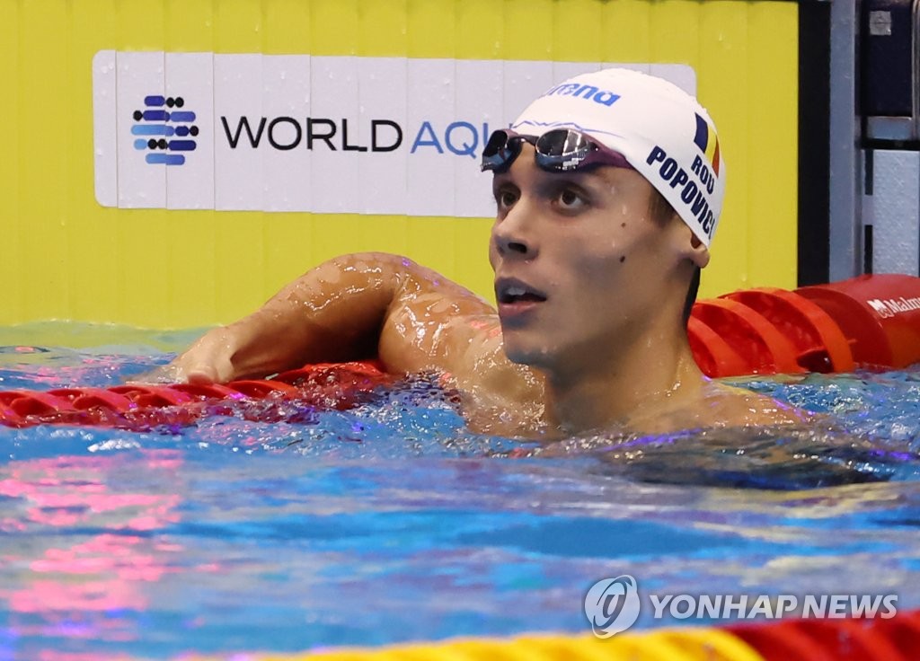 (후쿠오카=연합뉴스) 윤동진 기자 = 루마니아 다비드 포포비치가 24일 일본 후쿠오카 마린 메세 후쿠오카홀에서 열린 2023세계수영선수권 남자 자유형 200m 준결승에서 경기가 끝난 후 결과를 보고 있다. 2023.7.24 mon@yna.co.kr