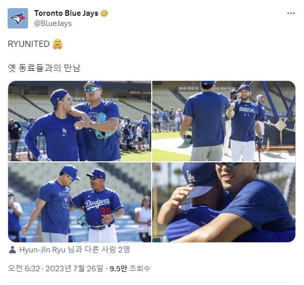 미국프로야구 메이저리그(MLB) 토론토 블루제이스 구단은 26일(한국시간) 소셜미디어를 통해 로스앤젤레스 다저스 선수단과 만난 류현진의 모습을 소개했다.