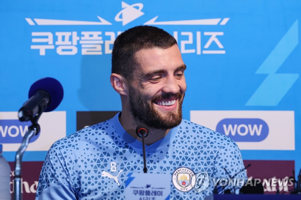 (서울=연합뉴스) 신현우 기자 = 맨체스터 시티(맨시티) 미드필더 마테오 코바치치가 29일 오후 서울 마포구 서울월드컵경기장에서 열린 쿠팡플레이 시리즈 2차전 맨시티-아틀레티코 마드리드 사전 기자회견에 참석해 미소짓고 있다.