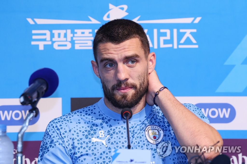 (서울=연합뉴스) 신현우 기자 = 맨체스터 시티(맨시티) 미드필더 마테오 코바치치가 29일 오후 서울 마포구 서울월드컵경기장에서 열린 쿠팡플레이 시리즈 2차전 맨시티-아틀레티코 마드리드 사전 기자회견에 참석해 취재진 질문에 답하고 있다.