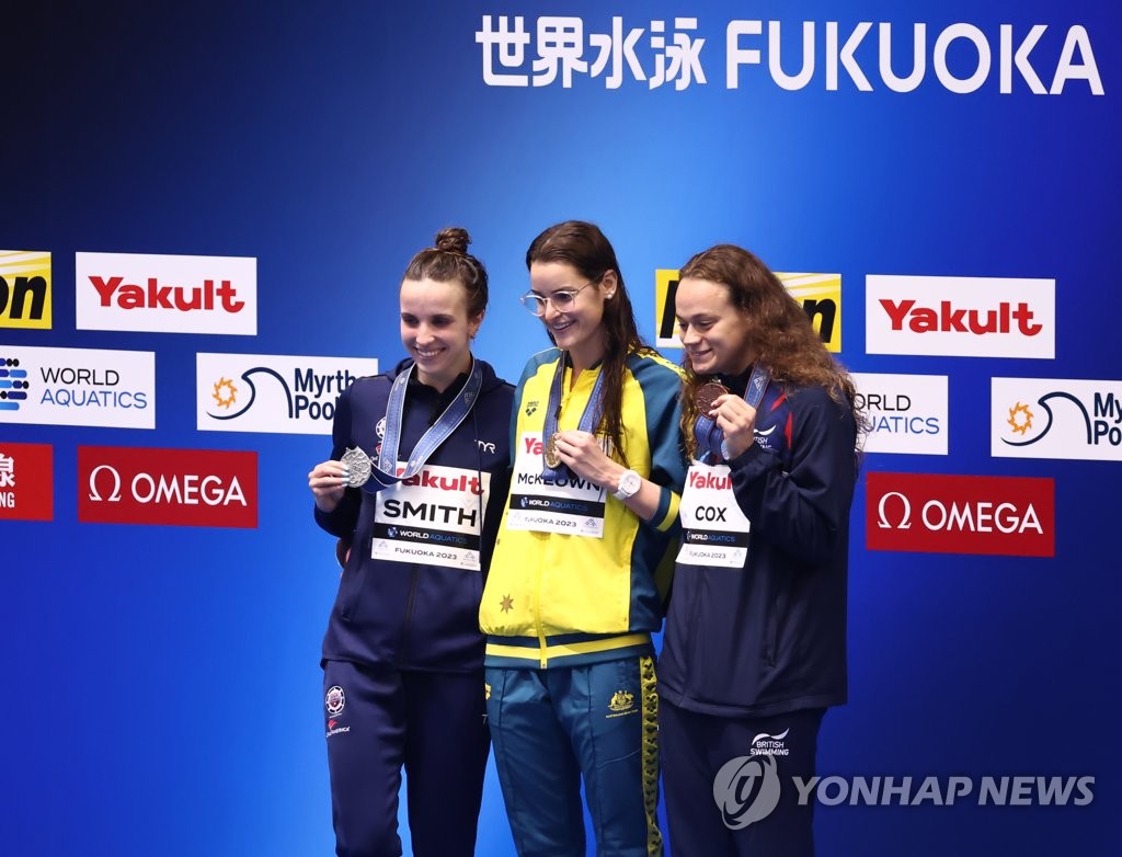 (후쿠오카=연합뉴스) 윤동진 기자 = 금메달을 획득한 호주 케일리 맥커운이 27일 일본 후쿠오카 마린 메세 후쿠오카홀에서 열린 2023 세계수영선수권 여자 50m 배영 메달 세리머니에서 기념촬영을 하고 있다. 2023.7.27 mon@yna.co.kr