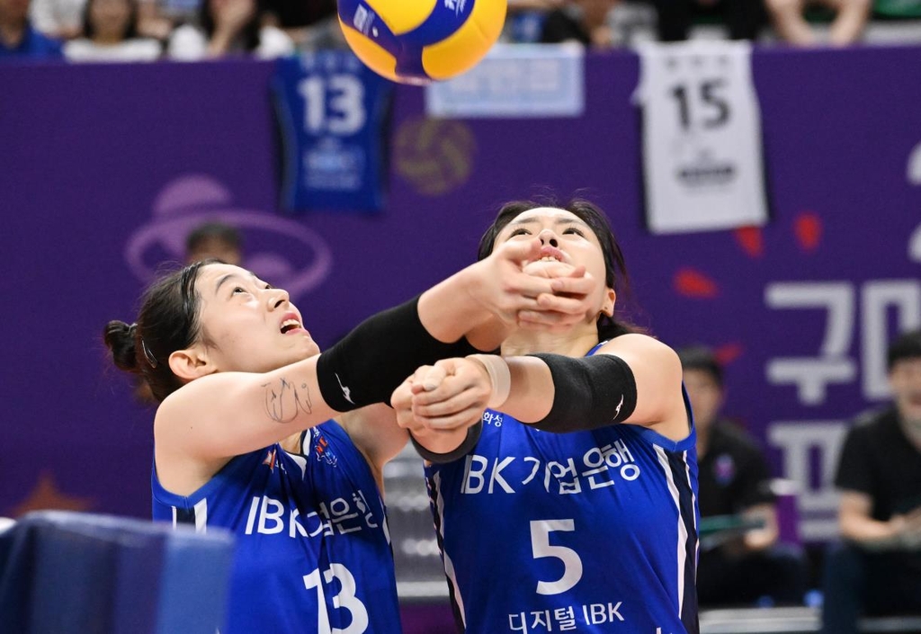 IBK기업은행 최정민과 김하경이 3일 경북 구미 박정희체육관에서 열린 컵대회 B조 조별리그 3차전 슈프림 촌부리와 경기에서 사인이 맞지 않은 채 수비를 하고 있다. [한국배구연맹 제공. 재배포 및 DB금지]