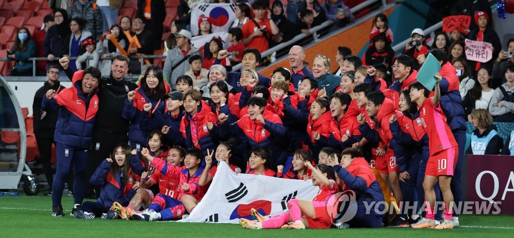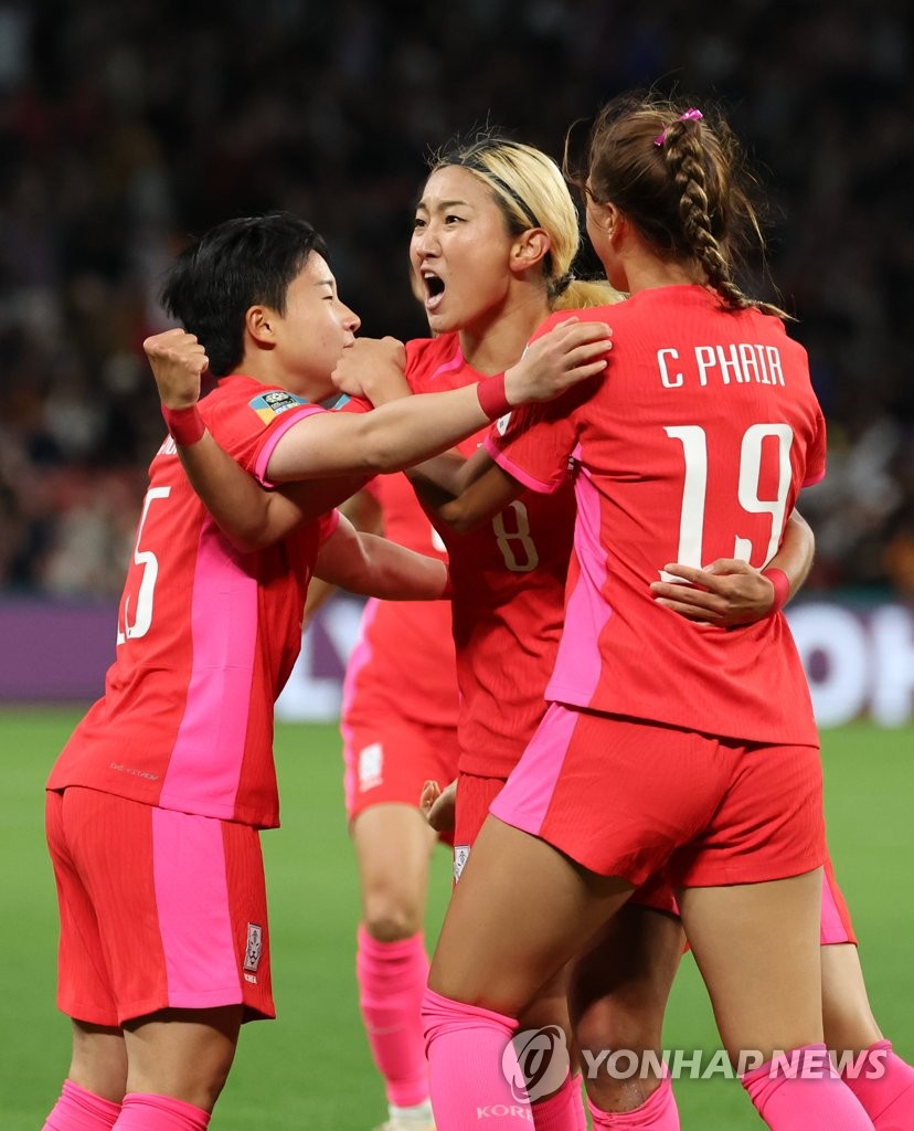 (브리즈번=연합뉴스) 김주성 기자 = 3일 오후(한국시간) 호주 퀸즐랜드주의 브리즈번 스타디움에서 열린 2023 국제축구연맹(FIFA) 호주·뉴질랜드 여자월드컵 H조 3차전 한국 대 독일 경기. 1-1 무승부로 경기를 마친 한국 선수들이 서로를 격려하고 있다. 2023.8.3 utzza@yna.co.kr