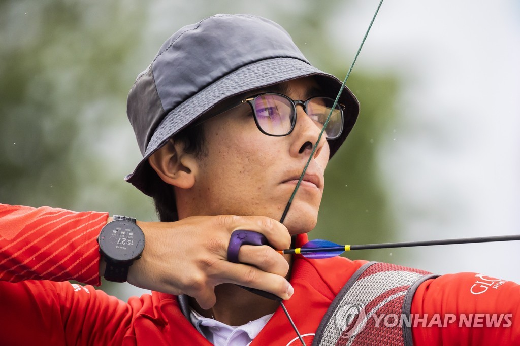 (광주=연합뉴스) 조남수 기자 = 2022 광주 양궁월드컵대회 개막을 하루 앞둔 16일 광주 서구 월드컵경기장 축구센터(옛 서향순 양궁장)에서 남자 양궁 국가대표 오진혁이 연습하고 있다. 2022.5.16 iso64@yna.co.kr
