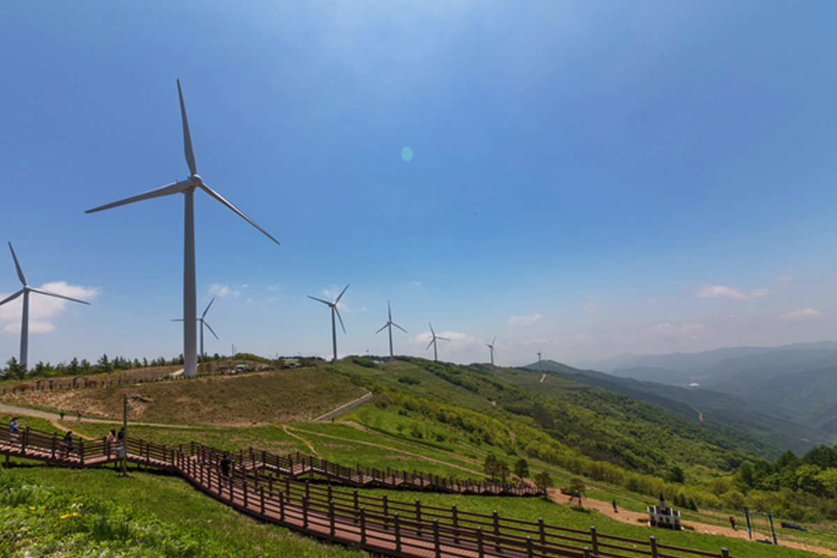 산 정상에는 20여 기의 대형 풍력발전기가 돌아가고 있어 한 폭의 그림 같은 풍경을 연출하고 있죠.