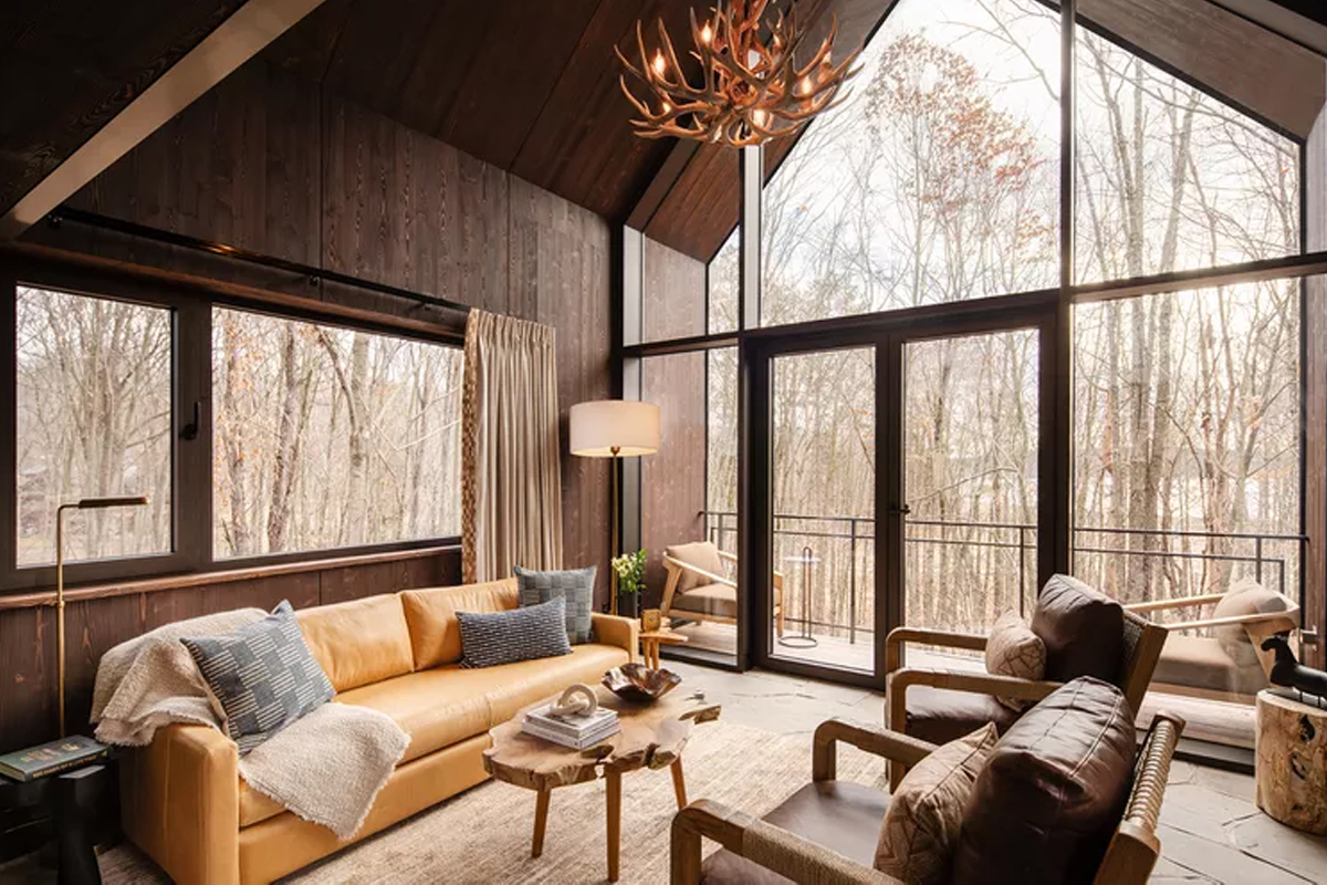 트리 하우스의 인테리어 디자인은 펜실베니아 필드스톤 바닥과 ‘Restoration Hardware’의 맞춤형 가구를 특징으로 하여 현대적인 분위기를 자아냈습니다.