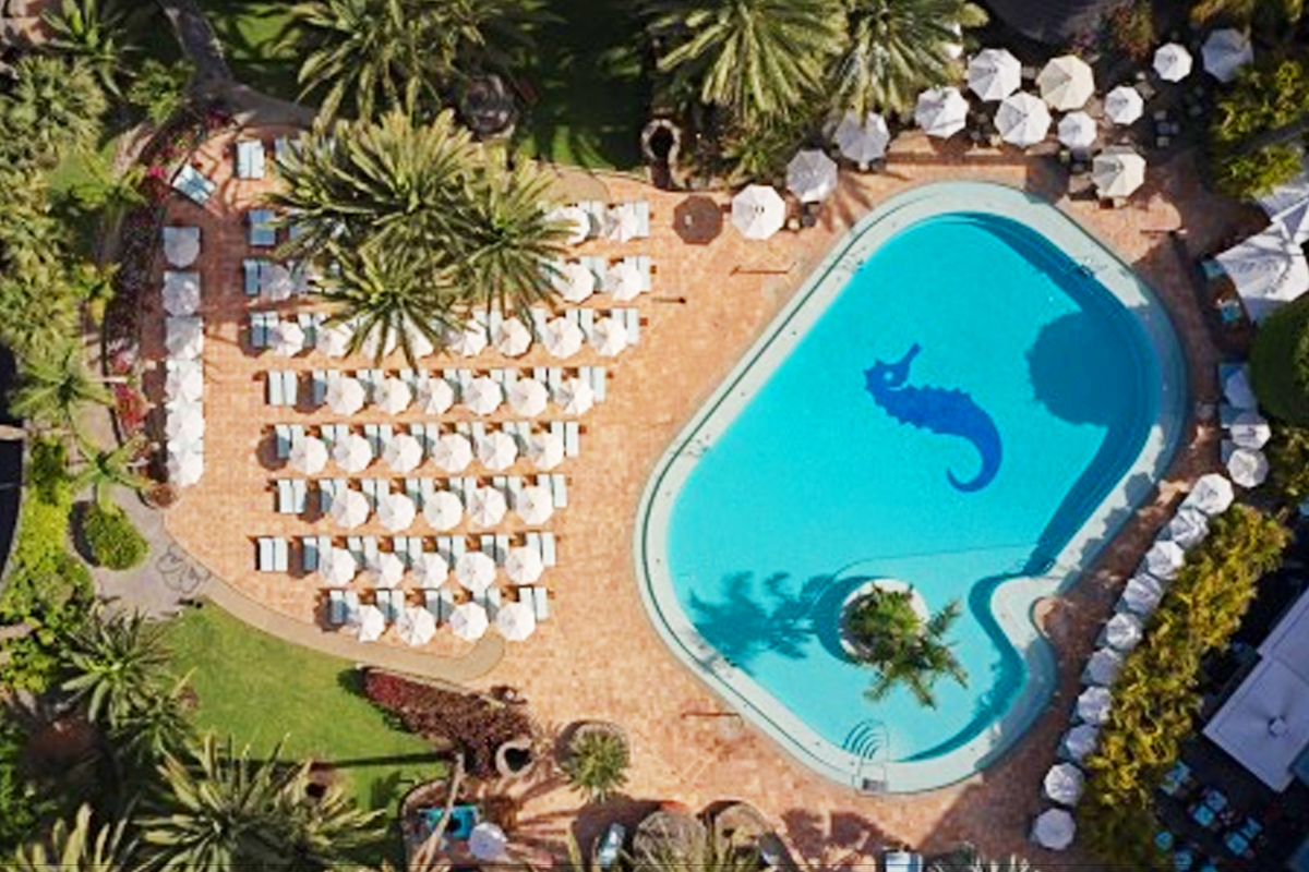 야자수로 둘러싸인 야외 수영장은 무척 아름답죠. 웰니스 스파 수영장도 이용할 수 있습니다.